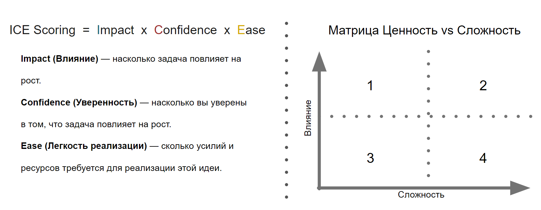 Я лично использую ICE Scoring, который помогает распределить гипотезы или задачи по их важности, и выбрать то, за что мы возьмемся в первую очередь.